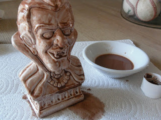 After letting them dry for 24 hrs. I then painted on a coat of watered down brown acrylic paint all over the statue! You really want to accentuate the creases! Then with a paper towel, gently wipe off the excess paint from the smooth surfaces leaving the paint in all the indented spots!